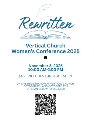 Get ready for this year's Women’s Conference at Vertical Church Blairsville! This year’s theme is “Rewritten,” and it’s going to be a great time for girls and ladies of all ages to come together in the name of Jesus! There will be fellowship, food, worship, a speaker, and fun and meaningful time together seeking the Lord!